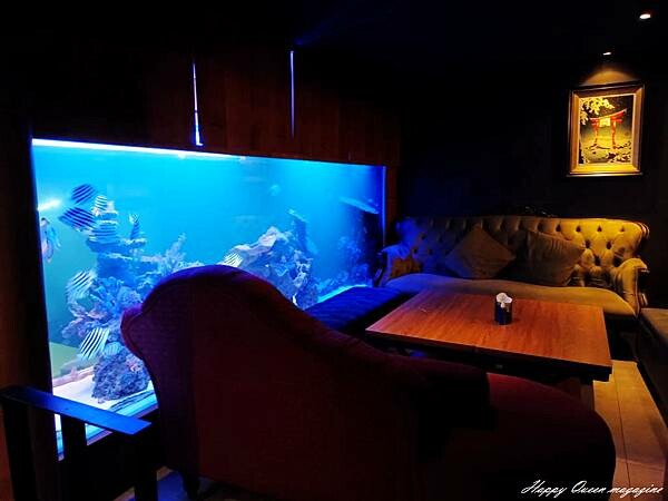 果然一走進『AQUA Lounge』就看到沙發區旁,有2座大型的海藍水族箱,加上典雅的裝潢、寧靜的氛圍,讓我們如同進入海底隧道,與外面車水馬龍的喧擾完全隔絶,好放鬆!