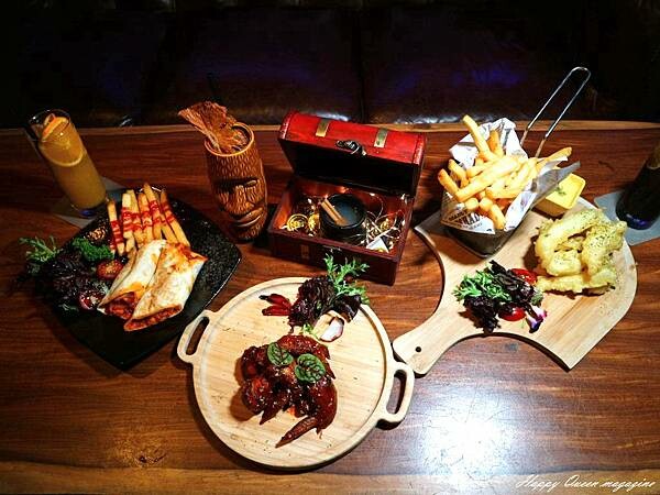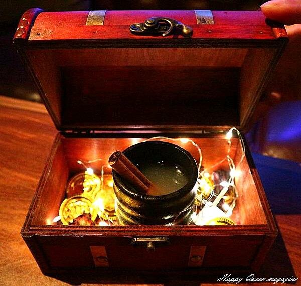 特調-珠寶盒$400,以珠寶盒裝著含有炙燒肉桂棒的神秘調酒,搭配不少金幣及小燈串,一開箱就華麗登場,我們彷彿找到寶藏一般,都大"哇"了一聲呢