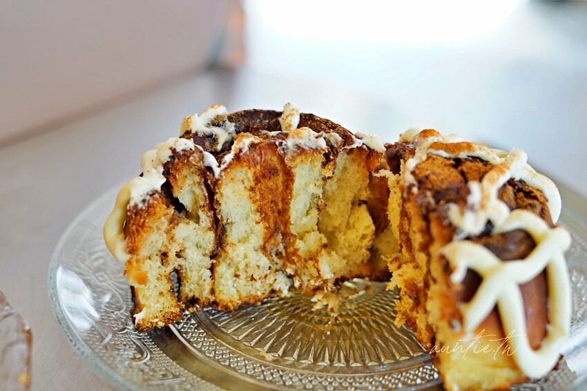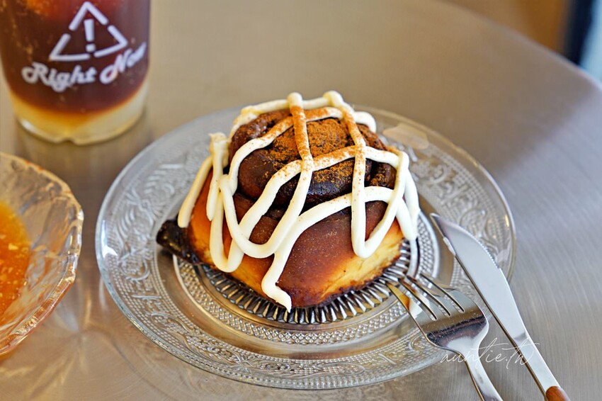 淋上奶油醬以及撒上肉桂粉,Right Now Cafe的肉桂捲香氣算是蠻重的,有微微的肉桂辛辣感,口感上有點乾,邊邊是焦的有點烤過頭😂,有點乾,配著奶油醬比較好一些。