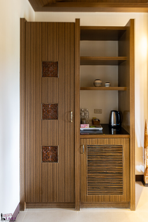衣櫃旁邊有放置著熱水壺、礦泉水、茶葉、咖啡和餅乾,準備得相當齊全。