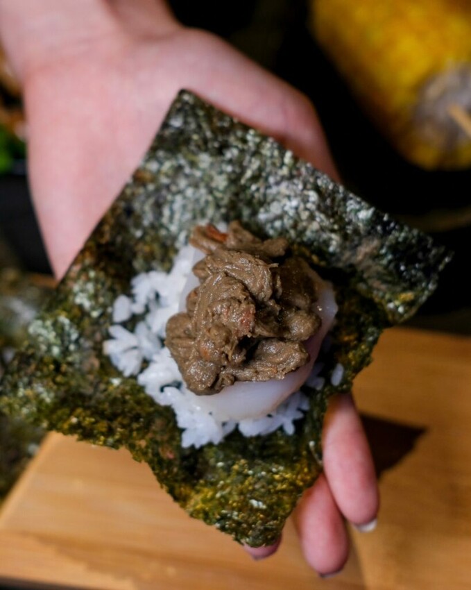 ▼明太子雞肉串咬起來超軟嫩,搭配頂頭滿滿明太子鹹香夠味;奶油和牛燒的軟嫩剛剛好,入口後能感受到明顯牛香,加上番茄的風味更豐富。