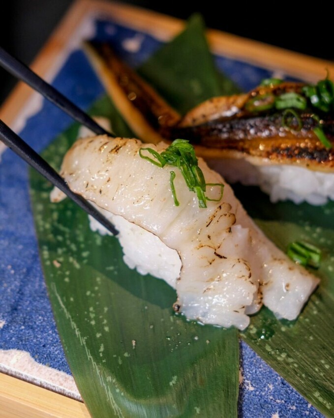 ▼比目魚與星鰻在火焰的炙燒下,染上了一層誘人的油亮色澤,結合了魚肉的鮮甜與燒烤香氣。