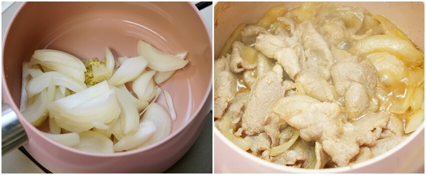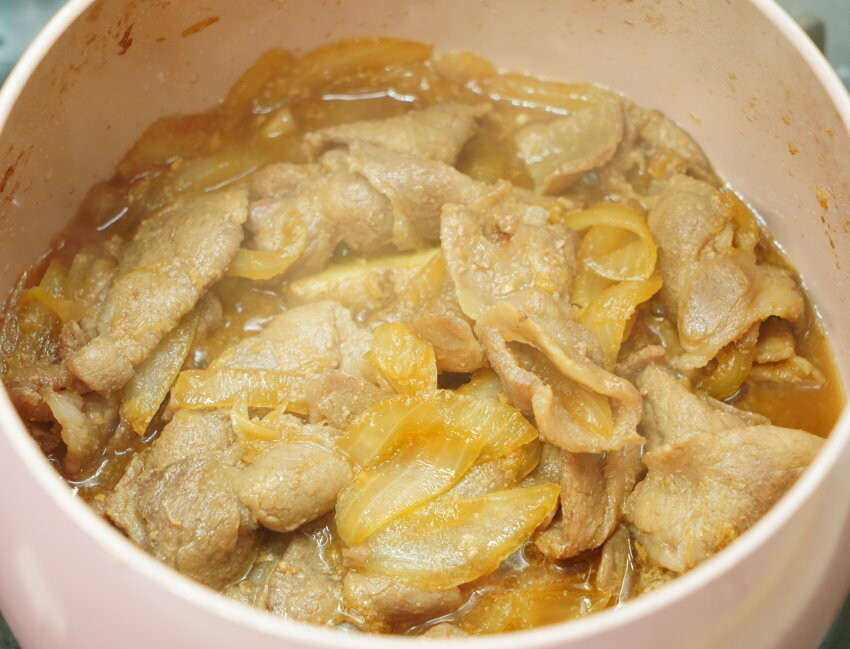 1.先在鍋中放入少許油,放薑泥、洋蔥絲下去炒香,等到洋蔥炒至半透明再放豬肉片下去炒熟,最後加入醬油、米酒、味醂等調味料,攪拌均勻後等到煮滾、醬料稍微收乾即可放置一旁備用。