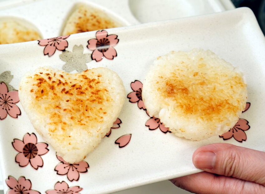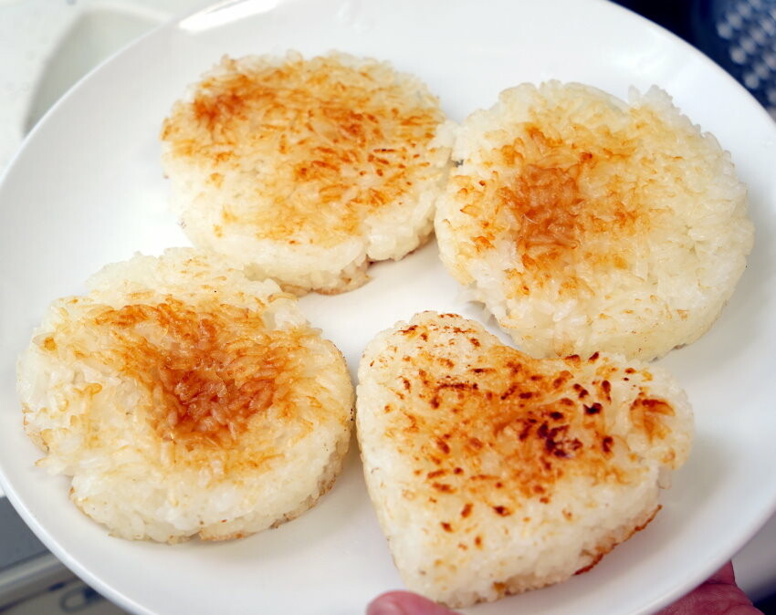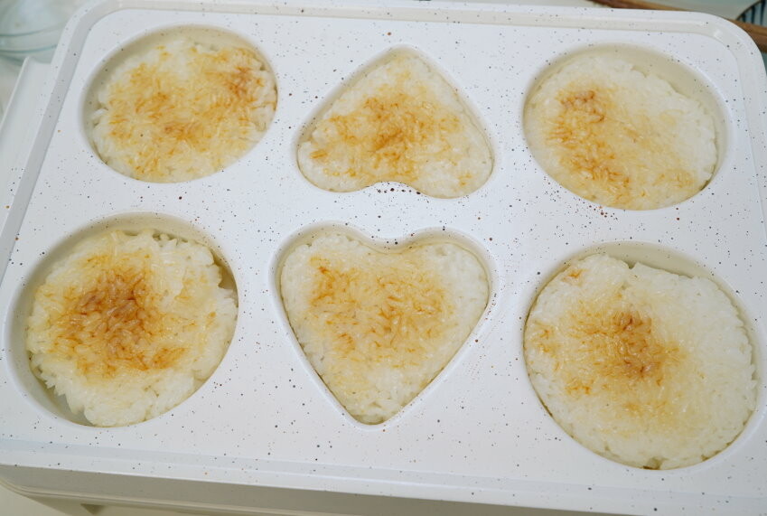 2.將米飯放進模具中,刷上醬油,將兩面煎至微焦就可取出。