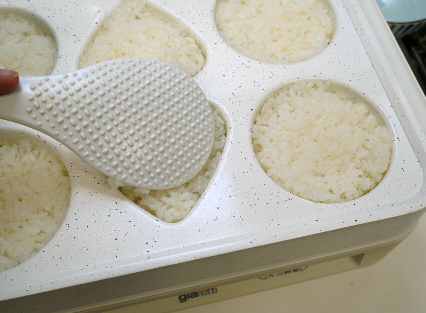 ▼接著換上愛心烤盤,就可以開始做米漢堡的外皮啦~~將米飯放進模具中,稍微按壓一下!如果家裡沒有烤盤的話,也可以用圓型模具或是保鮮膜塑型,再放入平底鍋刷上醬油、稍微煎一下即可!