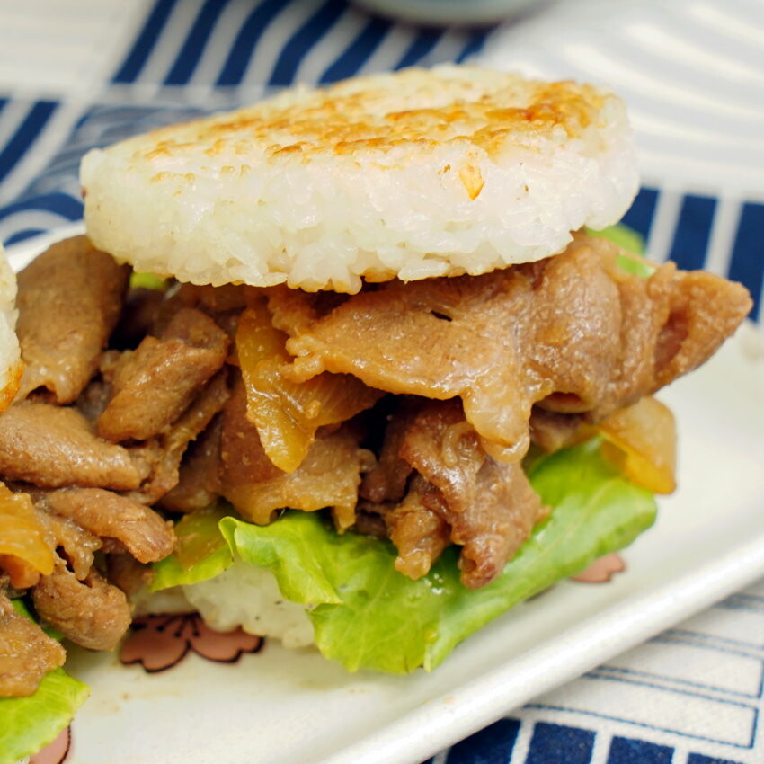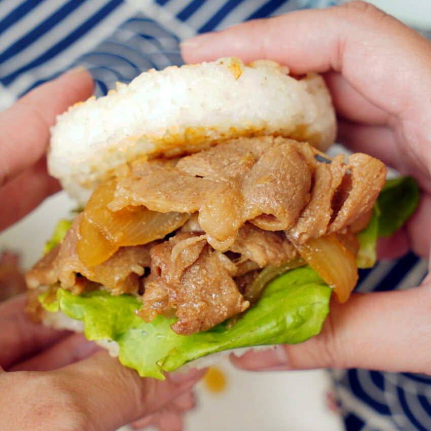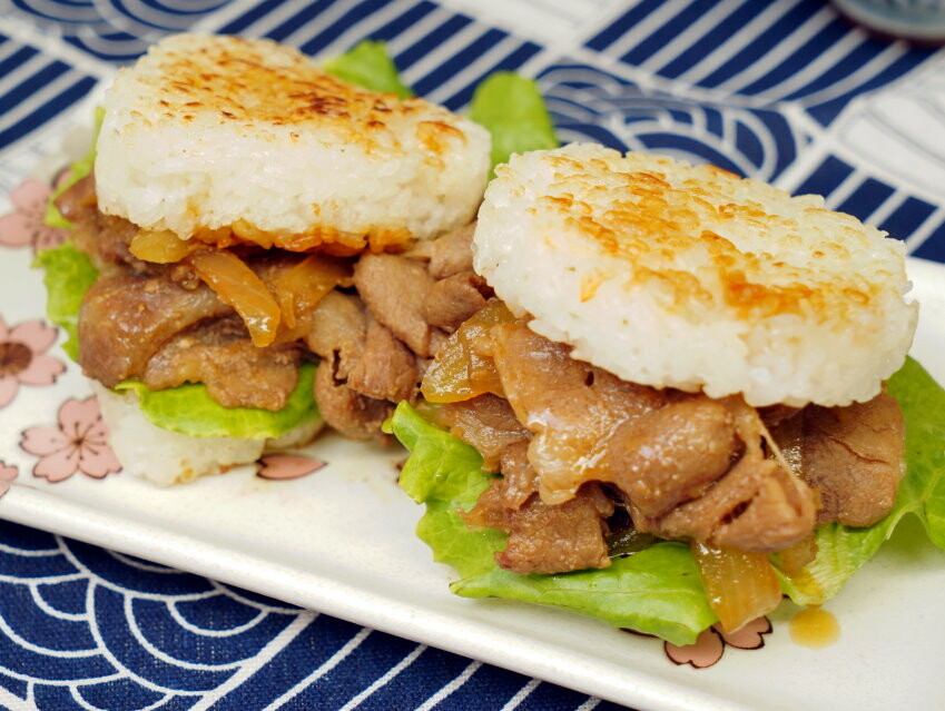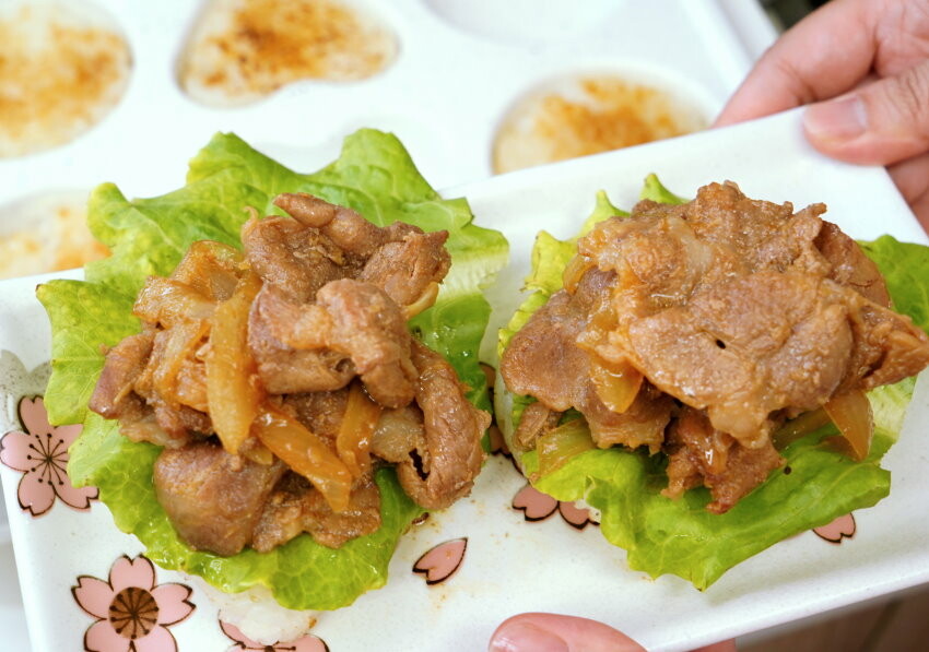 3.接著來組合米漢堡,先放一片米飯,鋪上生菜、薑汁燒肉,再放上另一片米飯就完成了。