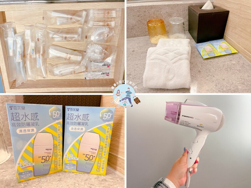 牙刷、梳子、刮鬍刀、吹風機等備品都非常齊全,也有附上小毛巾可以來擦臉、擦手~另外還有附上兩包雪芙蘭防曬乳,讓想去沙灘玩的旅客不怕曬黑!