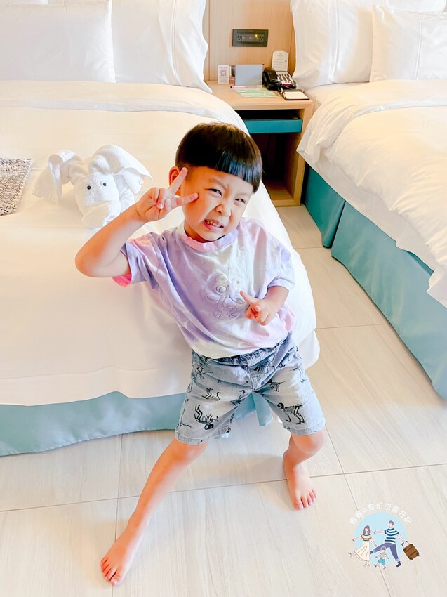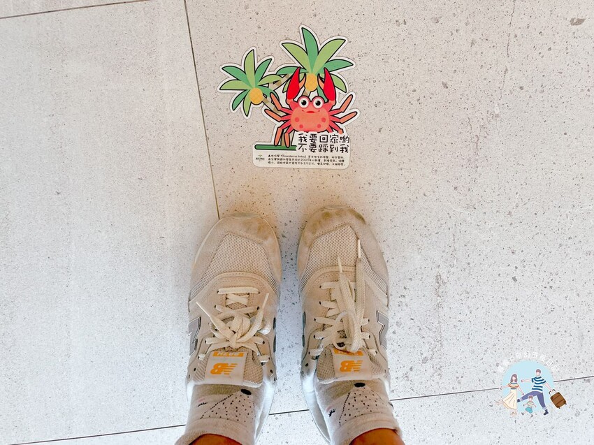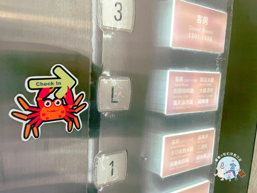 拿到房卡後就可以上樓囉!走去搭電梯的過程中還在地板到小心沙蟹的可愛標示,所以旅人要小心腳步以免踩到可愛沙蟹呦(笑)