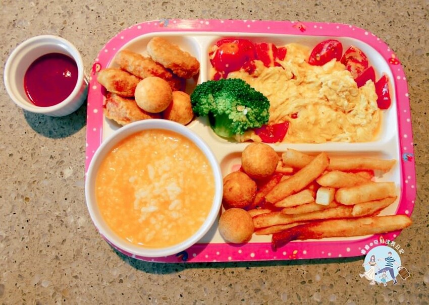 除了大人的早餐,餐廳人員也用了一份兒童早餐給睿睿,雞塊、地瓜球、炒蛋、薯條都是睿睿的愛呢!