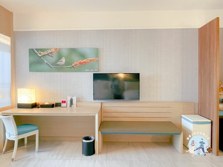 電視使用LED液晶電視,一旁的桌子剛好可以讓睿媽在這擺筆電上網寫文,沙發椅上也可以擺放個人物品!