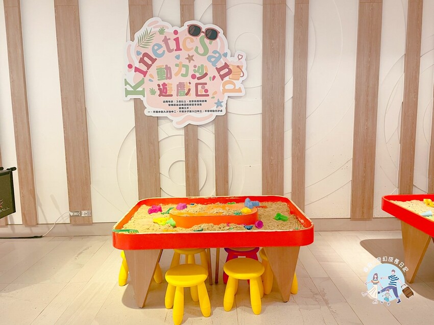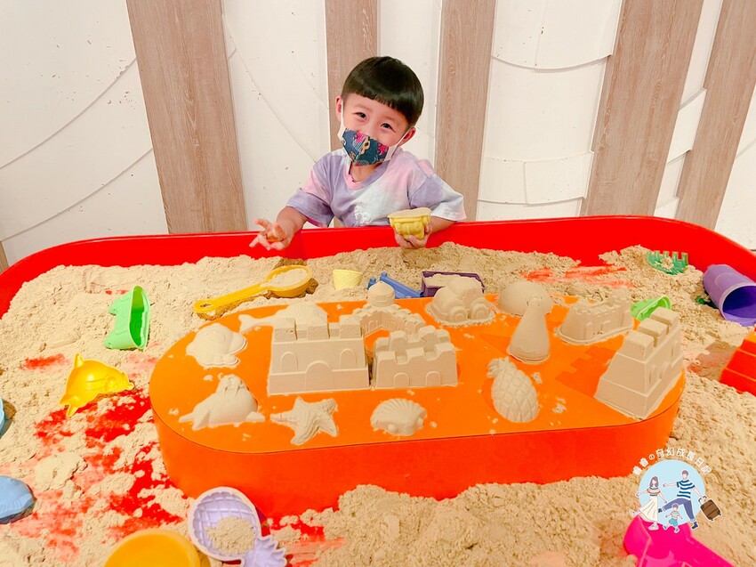 不用自己帶玩沙工具來,動力沙桌上的工具通通可以玩!車車、城堡、鱷魚、鳳梨、海星都是超可愛的模型~看睿睿玩的超開心!而且動力沙不太會黏手,非常適合寶貝們玩呢~