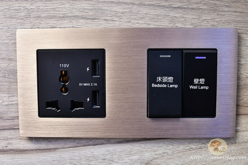床頭地方有房間電燈開關和1個國際通用插座、2個USB充電座,給3C充電很足夠。