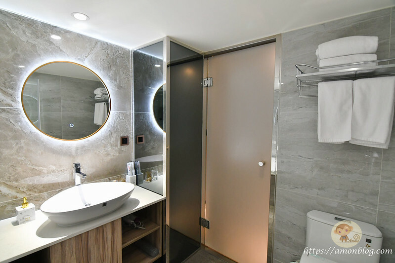 讓人有驚喜的是梳洗台上的鏡子竟然是還有背光的,如果覺得光線還不夠亮,想要更亮,就對著鏡面的小圓型按下去,光線就會更加明亮喔。