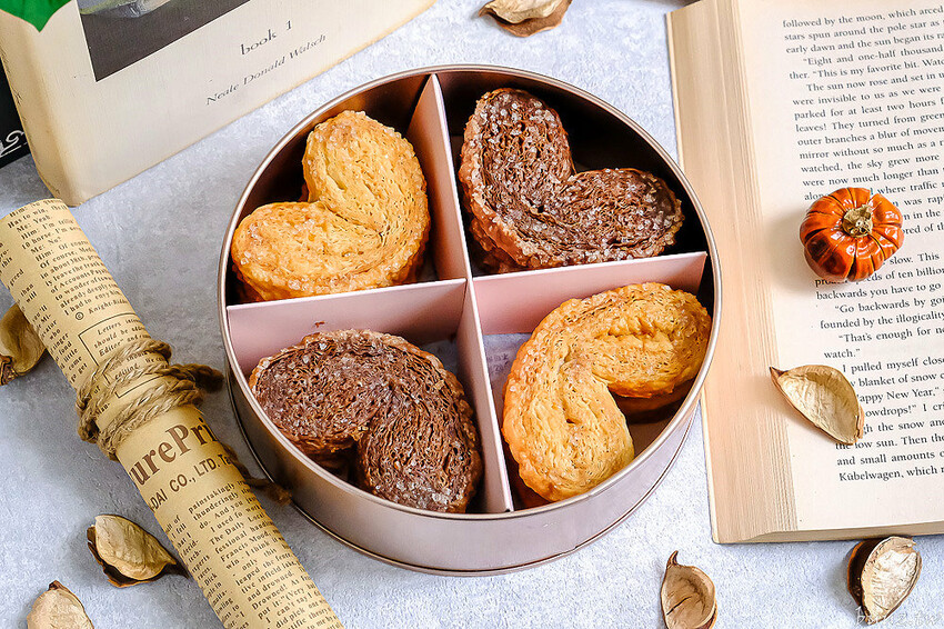店內手工製作的蝴蝶派只有販售單一口味包裝,不過顧客們一直很希望有雙拼口味可以買,於是在大家的殷殷期盼下,今年他們推出了中秋限定原味、可可雙拼禮盒款式。