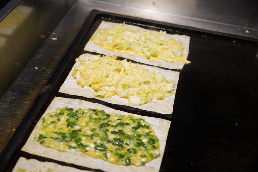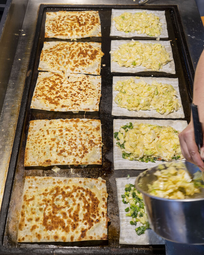 看著煎台上一片片的方形餅皮真的好療癒~~