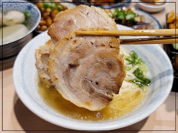 再來看看叉燒側邊,是有厚度的~讓我有個雖然當下吃的是台式拉麵