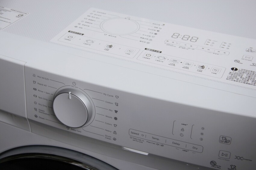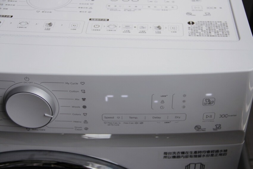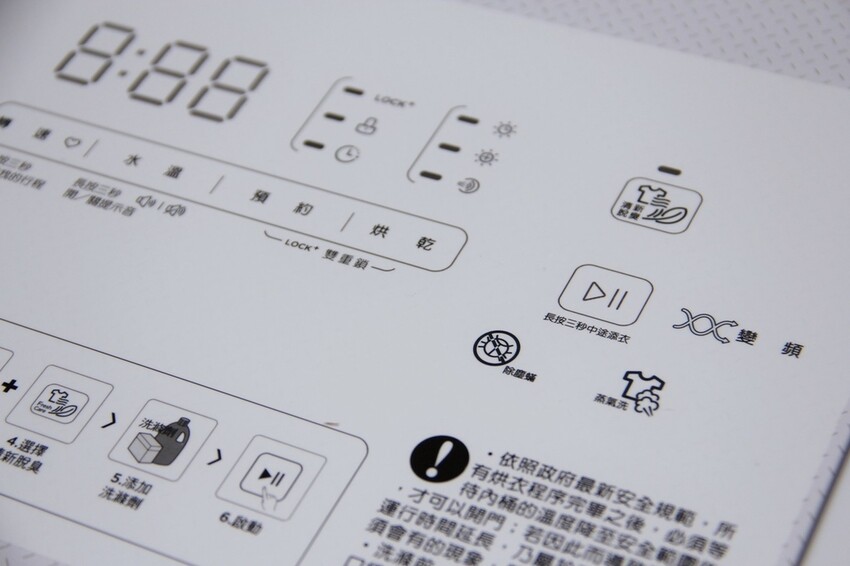 富及第蒸抗敏變頻滾筒洗脫烘洗衣機是全白系的操作面版很有質感,選擇好洗衣模式後,以觸控就可以輕鬆啟動,操作面雖然是英文,但平台上有中文對照說明,其實用久大概就會熟悉了,也不用太擔心!