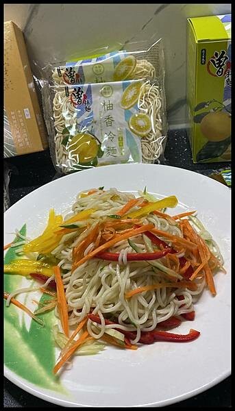 將冰鎮的好的柚香冷麵拿起放入夏日自己愛吃的食蔬