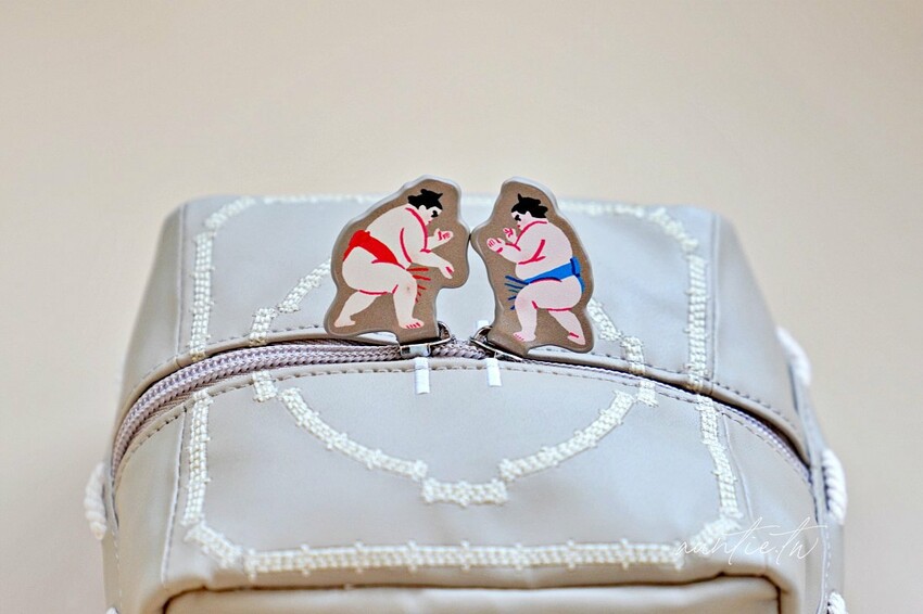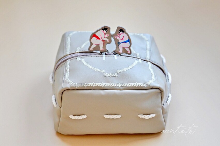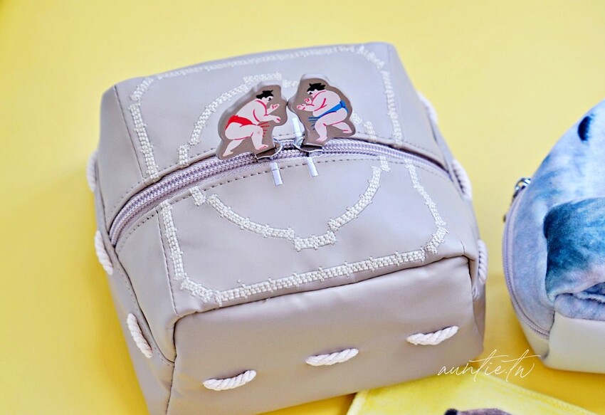 化妝包設計就是個相撲土俵擂台方形形狀,拉鍊處就是相撲力士造型,隨時隨地準備開戰的slogan真的很逗趣,奶茶色系也不容易弄髒,化妝包容量很大,不論是保養品或是眼鏡都放得下去。