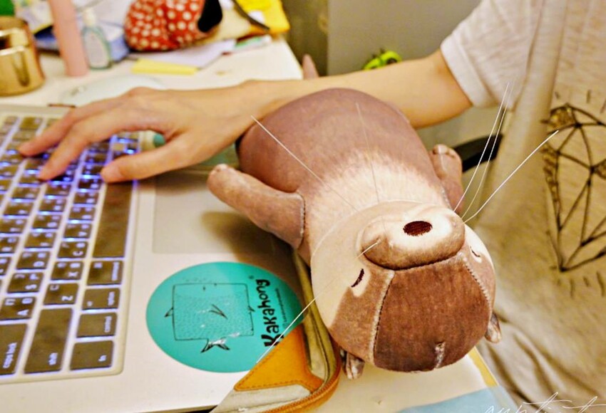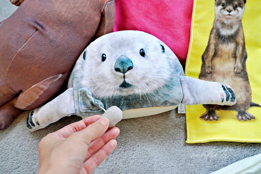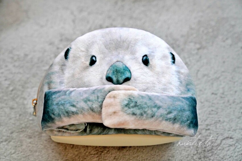 最喜歡的就是這個水獺化妝包,水獺看起來就像真的漂在水上睡翻天的萌樣,手腳都好逼真,背部打開可以當成筆袋使用,平常使用電腦也可以當成手腕的靠墊,軟呼呼的摸起來很舒服!