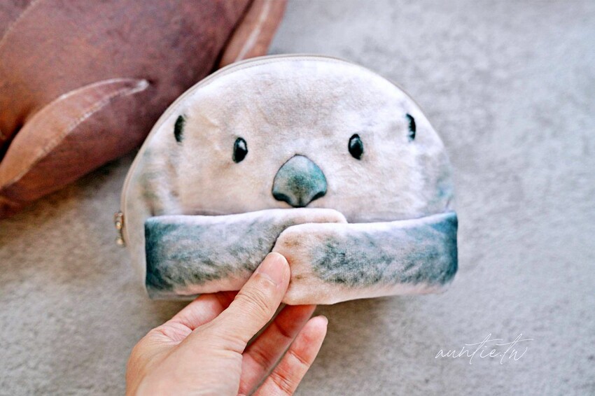 有三種款式,海獺的手手就是磁鐵,可以把手黏在眼睛或是嘴巴上,摸起來是柔軟的毛絨感,而且還附上一個像小石頭的擦拭布,可以擦手機螢幕,真的是很貼心的設計。容量也很適中,不論是裝化妝品或是小物品都很適合。