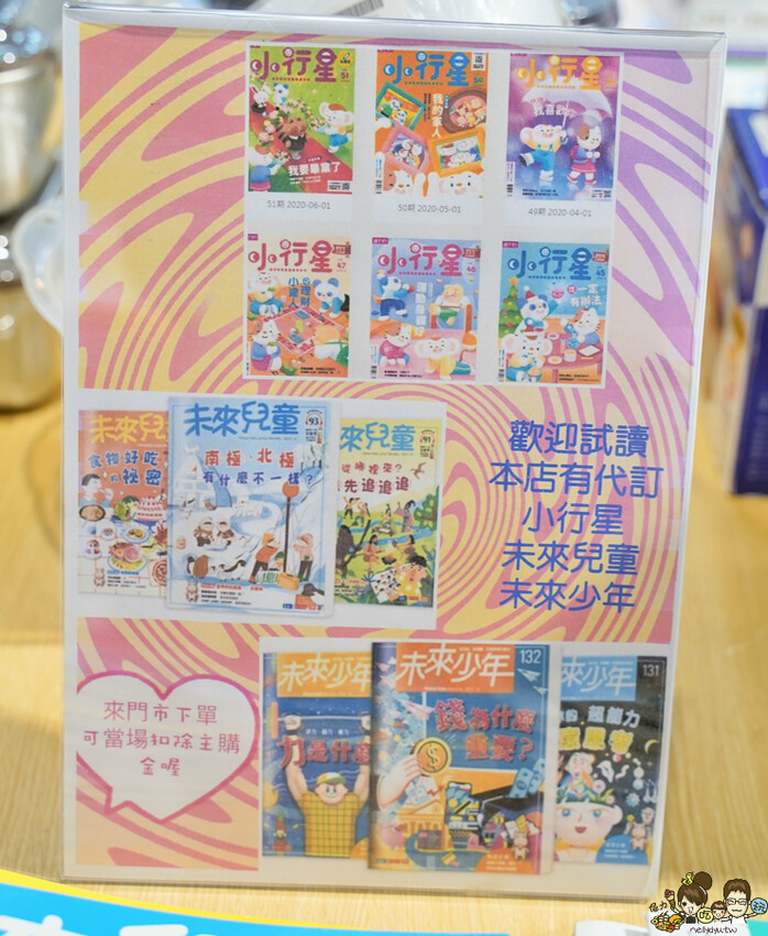 還有小行星、未來兒童及康軒學習雜誌也可以到 丹爸朝明店訂購,每個月少吃一個麥當勞餐點