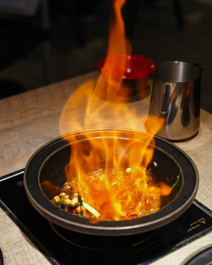 ▼由店員貼心桌邊熱炒服務,依序加入鴨血秘製辣醬和蔥段,食材在鍋中翻騰冒出火焰,享用前就帶來震撼的視覺效果。