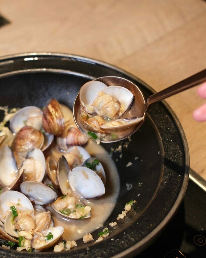 ▼煮完後單吃炒過的蛤蠣鹹香鮮美,倒入特製湯頭後吸附滿滿蛤蠣精華,蒜香中充滿鮮甜的濃郁海味。