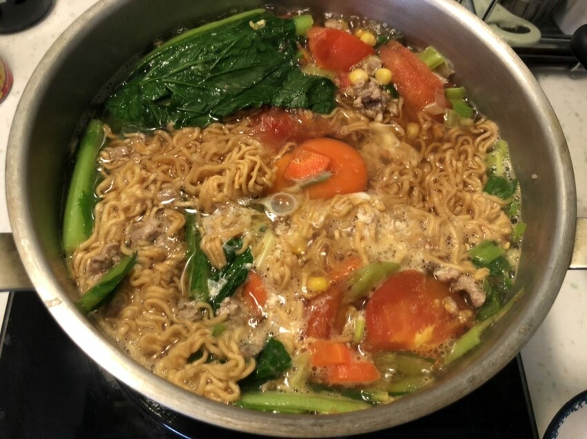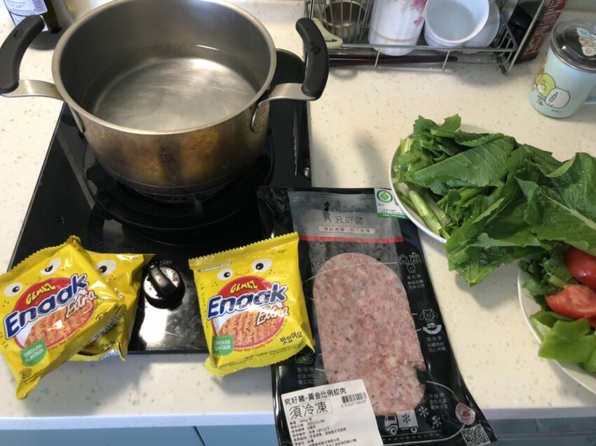依序加入麵條、青菜、番茄,3分鐘立馬上鍋,有肉有菜好滿足~究好豬的絞肉吃起來無腥味,彈牙肉質,一吃難以忘懷。