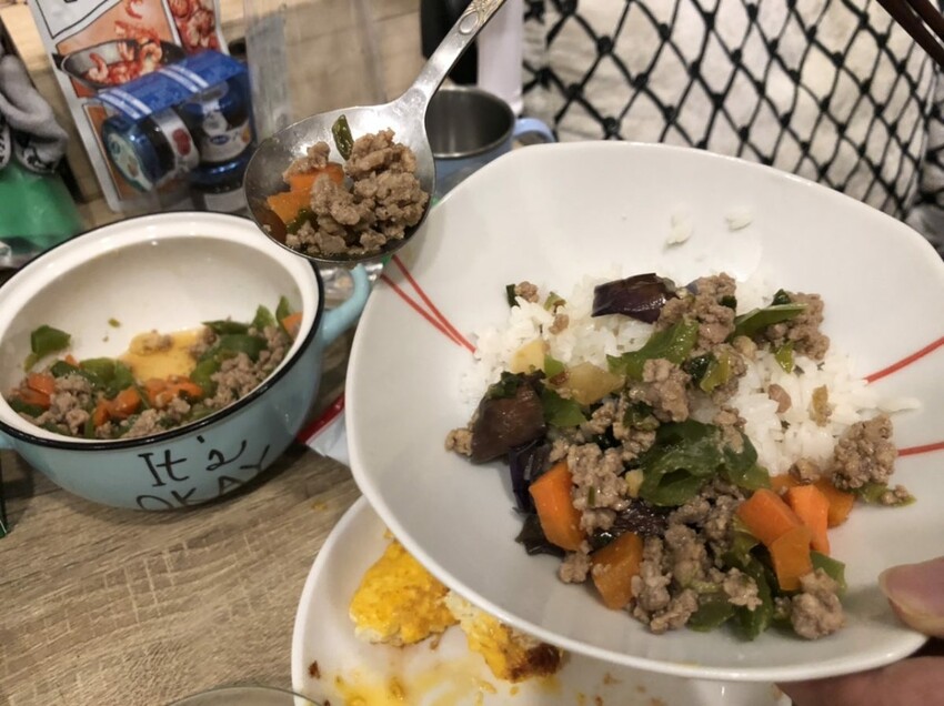 將肉末先放入鍋內炒熟,再依序加入紅蘿蔔、青椒拌炒,加點醬油提味,好下飯~