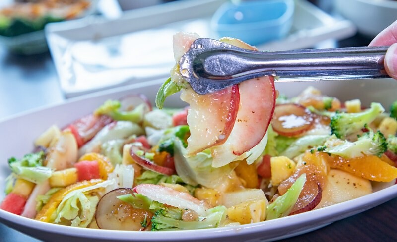 蜜桃醬水果沙拉,除了水蜜桃外裡面還有蔬果、橘子和不少種蔬食,以店裡特製的蜜桃醬拌食,入口有著各式各樣的甜,尤其是蜜桃醬和生菜的搭配,讓我這個平常不太愛吃生菜的都吃了四五大口,尤其水蜜桃爆甜爆多汁。