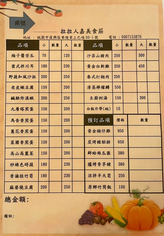 拉拉人嘉美食莊(fb粉絲團):桃園市復興區巴崚60-1號,電話:0967 153 876,營業時間:11:00-13:30、17:00-18:30(不定休最好先電話確定)