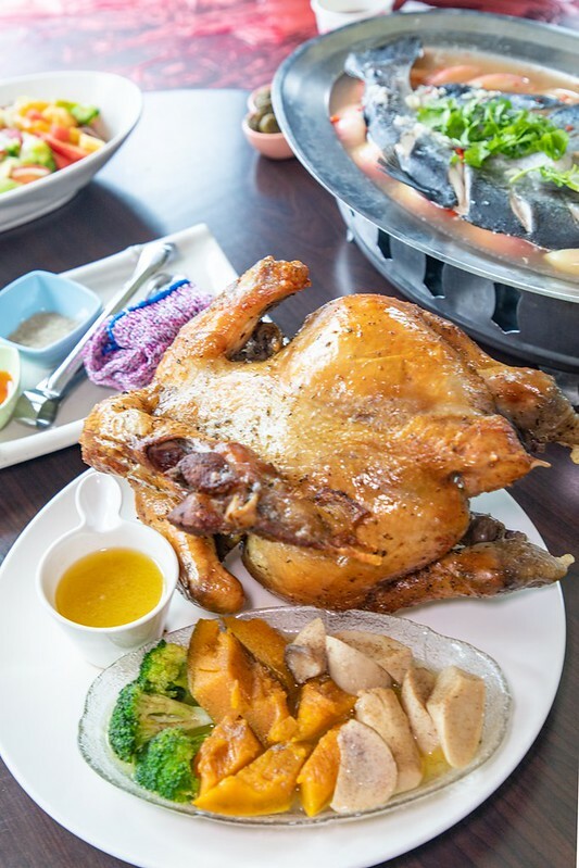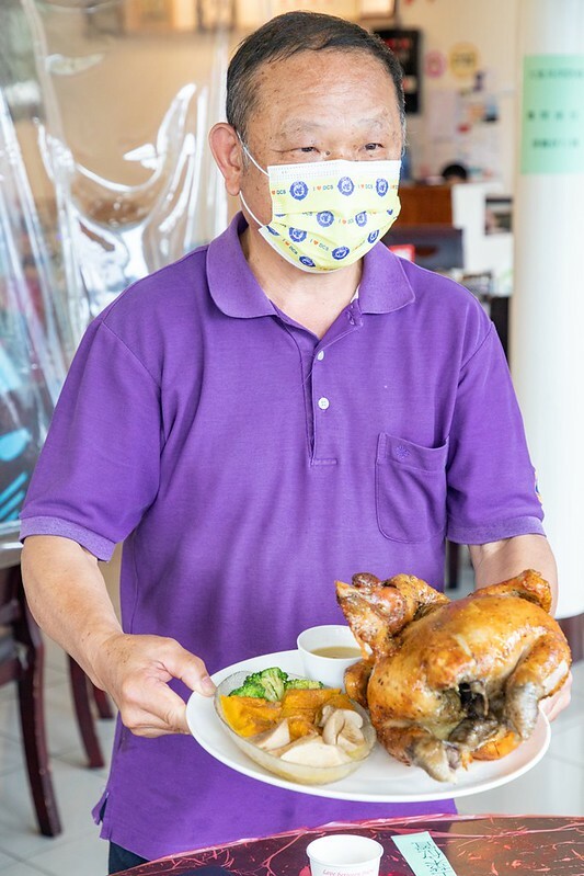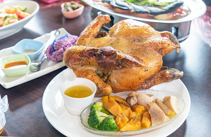 招牌黃金桶仔雞是店裡的招牌,是許多上拉拉山、巴陵指定的名物,為了它專程開車上山的也所在多有,另外搭配了一份淋上雞油的蒸花椰菜、南瓜、杏鮑菇。