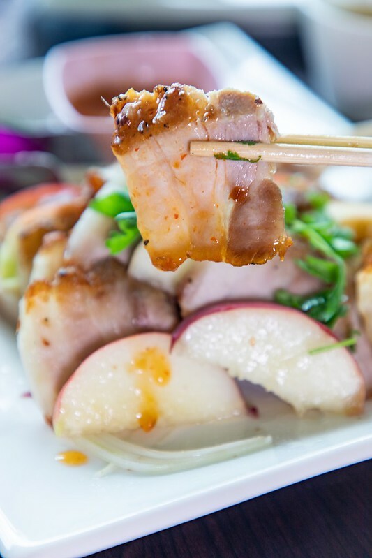 爐烤香茅豬搭新鮮水蜜桃,略帶泰式的烤法,烤得恰到好處,肥肉的部份剛好溢出油質,瘦肉的地方又不止於過於乾柴,本身就非常好吃,沾上特調的泰式辣椒醬更為美味,挾上一片水蜜桃相佐,咀嚼端多出飽嘴的水份,味道端水蜜桃也帶出豬肉香茅的另一個層次的香氣,尤其是和肥肉油質的搭配,爽口又油甜,沾上辣椒醬居然也能行。水蜜桃和泰式辣椒醬,你能想像嗎?