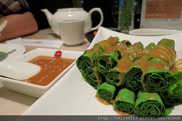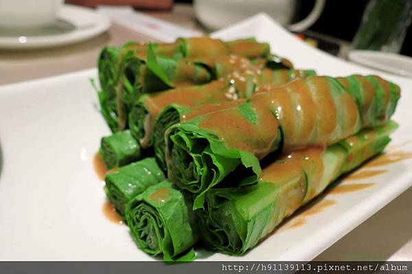 將油麥菜捲起來後 ~ 用小黃瓜片包住 ~ 上頭在淋上香濃的芝麻醬 ~