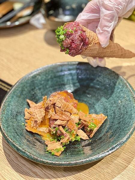 將日本A5和牛牛肉山淋上雪白的「山藥泥」後,
