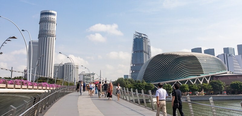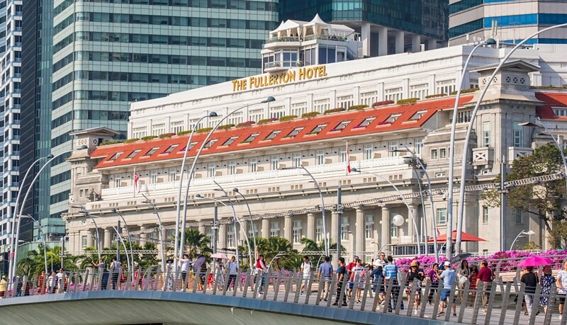 走過濱海橋時,你可以欣賞到橋邊緊臨的是,建於1928年的前身為浮爾頓大樓的「富麗敦酒店」,曾為新加坡郵政總局及多個政府部門的辦事處,1996年由信和集團和政府合作改建成酒店,2001年由當時的總理吳作棟正式啟用。其新古典主義外觀擁有兩層高的多立克式巨形柱廊、外牆的古典雕塑由瑞士雕塑家Rudolf Wening和意大利雕塑家Cavaliere Rudolfo Nolli製作、拱形格子天花板等多項建築特點,其身後是新加坡此起彼落的高聳的商辦大樓。