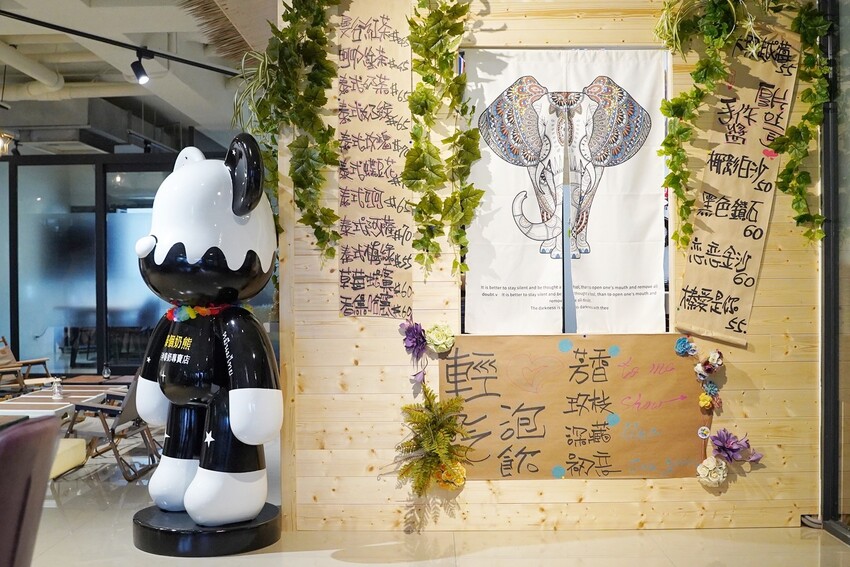 店內特別以泰國攤販樣貌呈現,融入茅草屋、棕梠樹等等泰國元素,有一秒來到泰國的感覺~重點是還有隻超大的庫柏力克熊,超適合拍照打卡。