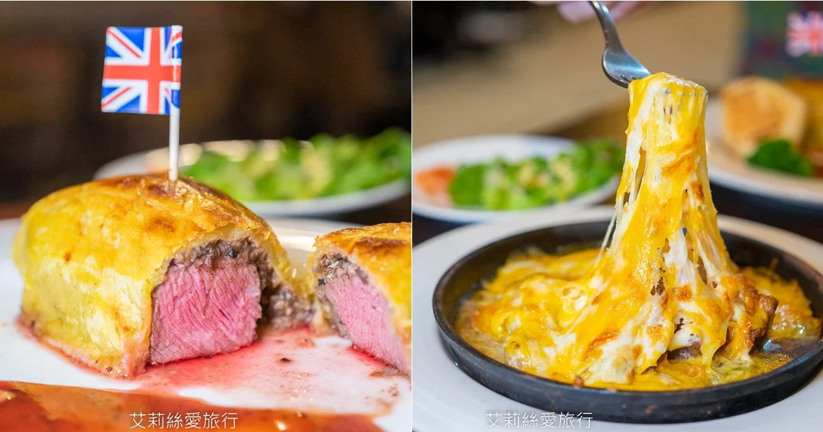 威靈頓牛排是一道經典英國料理,送餐上來還插上英國國旗有夠可愛,