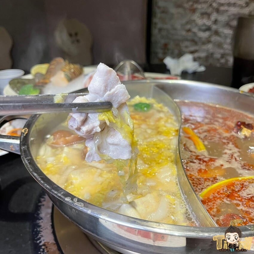 酸菜鍋是酸V帶甜的湯頭,本身會附上一些凍豆腐及幾片白肉,大家可以再點白肉來涮很過癮。