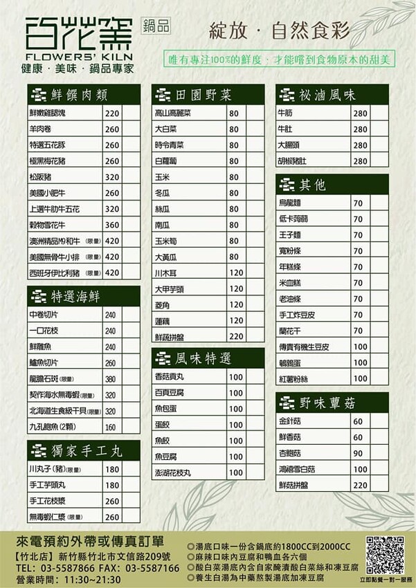 百花窯在竹北及新竹各有一家分店,北大店位於北大路靠近中正路口,開車的朋友需要停北門街或演藝廳對面停車場,再走過來大概不到5分鐘路程囉。