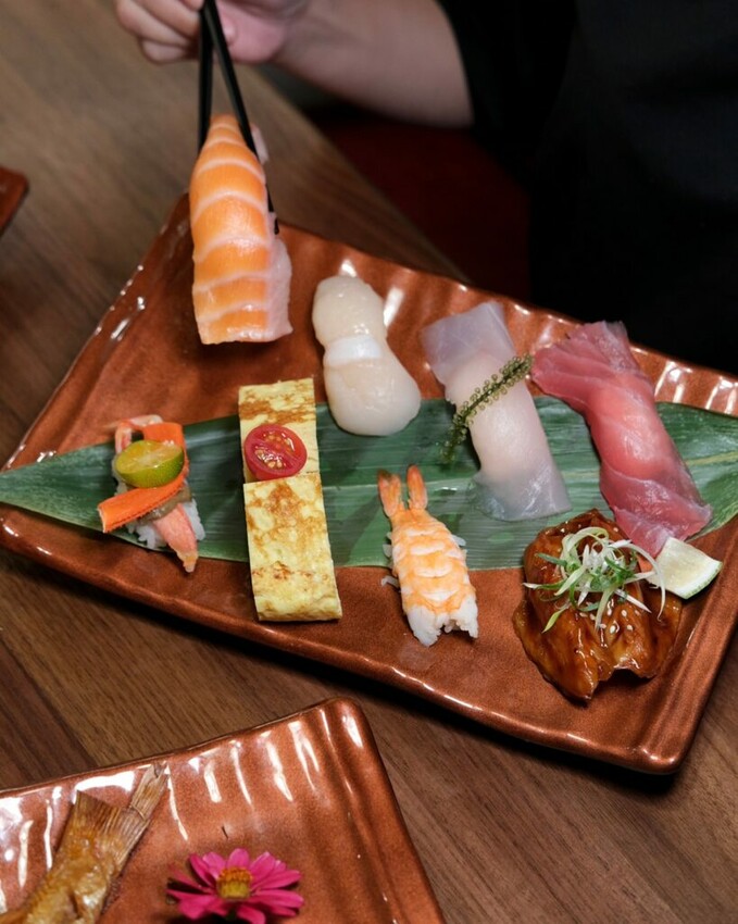 ▼由師傅現捏現做的綜合握壽司,包含生食級干貝、玉子燒、蟹腳、黑鮪魚、蒲燒鯛魚、鮮蝦、鮭魚和花枝,醋飯捏得很紮食調味也剛剛好,食材上的變化和質量都很不錯~