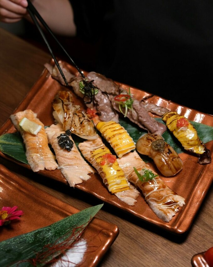 ▼榮登心中第一名的焦糖鮭魚,脆口的表層焦糖,跟著細緻的鮭魚肉,融合出入口即化的甜蜜滋味,將兩款食材結合炙燒蟹膏干貝,軟嫩口感中滿是濃郁鮮香,完全沒有腥味;另外起司系列也是必點項目,不管搭配鮭魚、鮮蝦等食材都很美味。