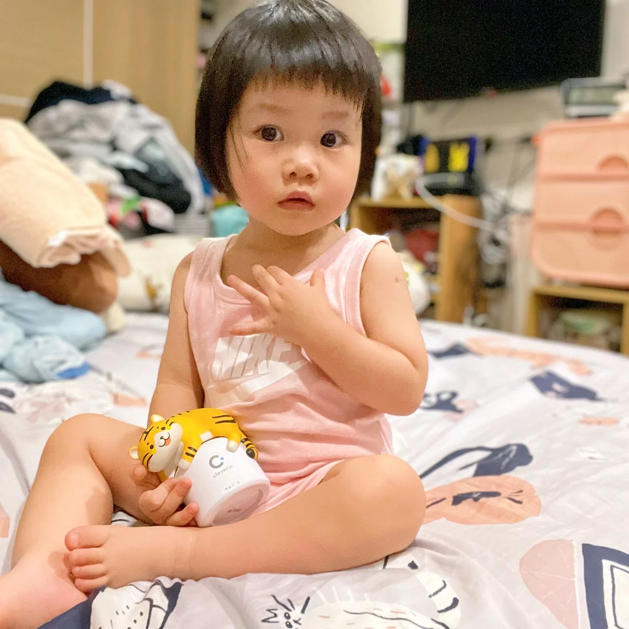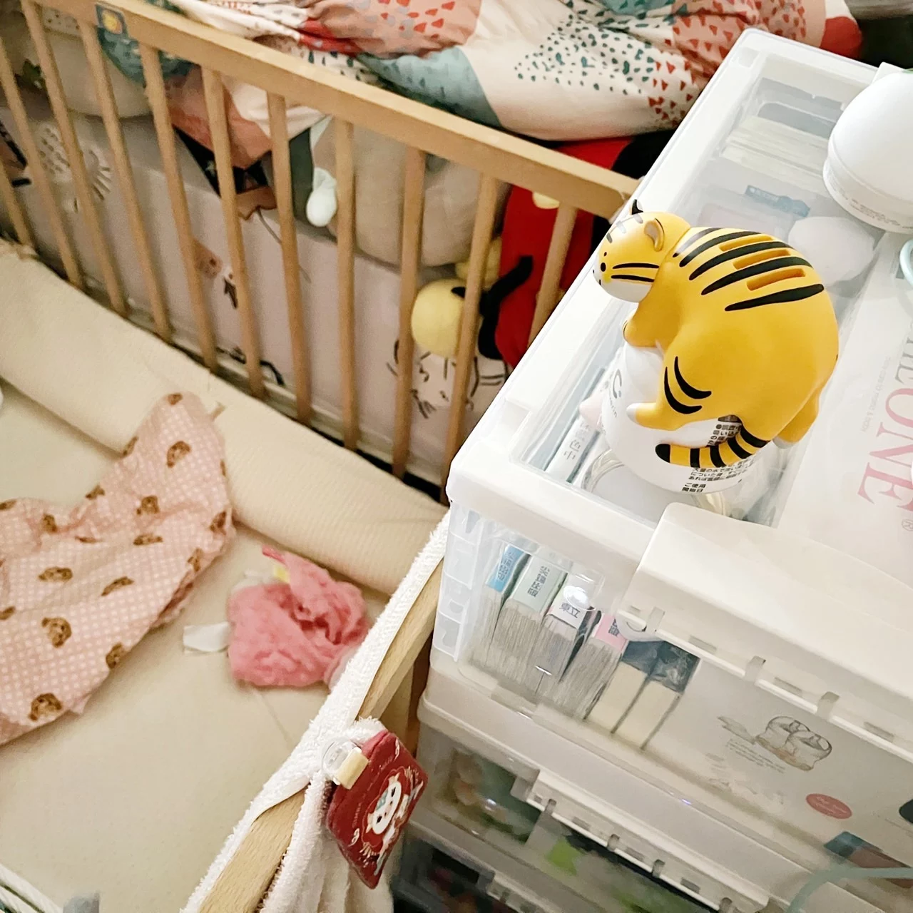 之後再將瓶子擺在家中想要抑菌的位置,像是玄關、客廳、廚房、廁所、嬰兒房等處,一般在家裡使用我都會同時擺2~3個,蠻建議可以擺在孩子常活動的範圍處,像我就選在嬰兒床旁的櫃子上,這樣是不是很像今年的虎神在守護著Miki呢!