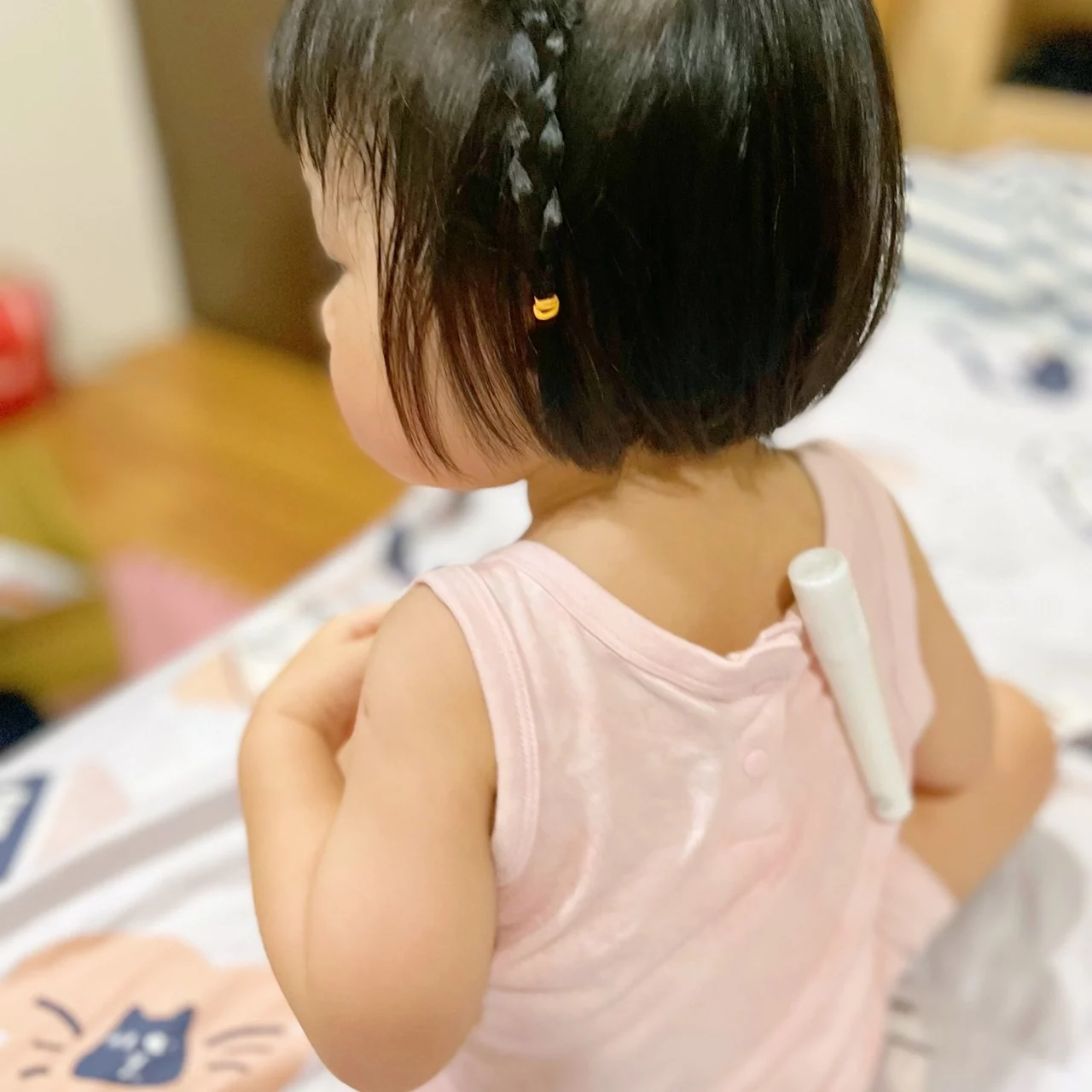 一開始筆型我還想著要不要找個繩子綁起來,但是也很難固定好,最後才靈機一動,直接夾在衣服背面,不會被Miki無聊想抓下來玩,也很穩地被夾在身上喔!
