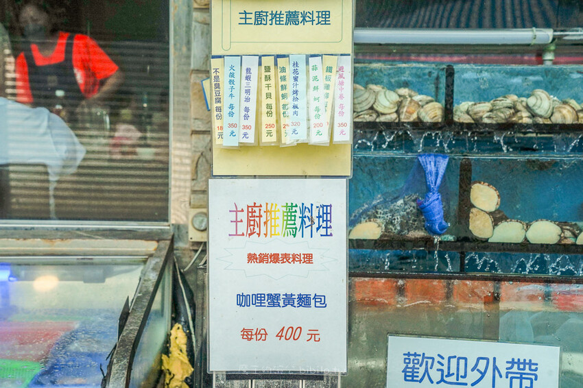 店門外面就是滿滿的活海鮮們,有蟹類/貝類/龍蝦/鮑魚等,都是以兩計價,價位也蠻透明的,且海鮮也是當面拿給客人看,不用擔心被凹。