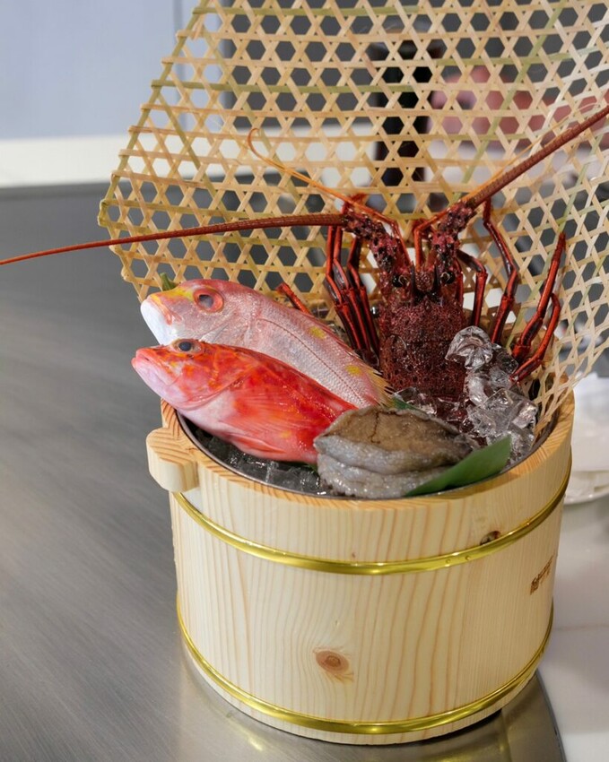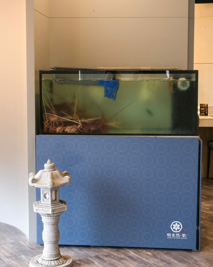 ▼【明水然・樂 】門口大大的燈籠是經典識別,甚至有人在台北店門口的燈籠求婚,旁邊則是活體龍蝦的水族箱,新鮮食材的來源看得見,預約制的無菜單鐵板燒,僅提供兩個月內場次預訂,預約後須先付清款項,到店只要安心用餐,專心享受主廚的料理饗宴。