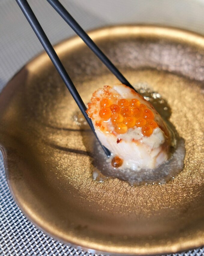 ▼來自北海道的生食級干貝,在炙燒過後釋出鮮甜滋味,中心的口感軟嫩,頂頭再放上日本松葉蟹膏和鮭魚卵,海味在口中逼逼波波的爆炸。
