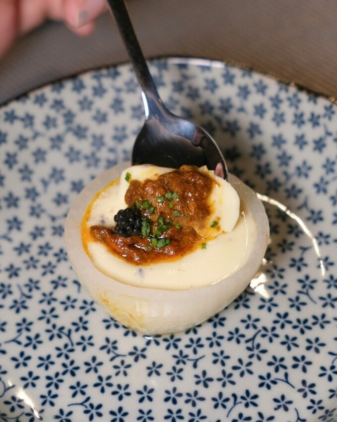▼以洋蔥為容器料理成蒸蛋,口感滑順細緻,混著魚子醬和龍蝦蝦膏,整體的風味充滿將炙燒後的龍蝦頭燉煮成湯,並層次不無聊。