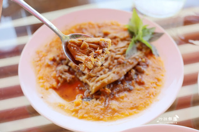 這道料理花上1個多小時,將地瓜弄成泥蒸煮後,在與地瓜悶煮,裡面有小魚乾、干貝醬提味